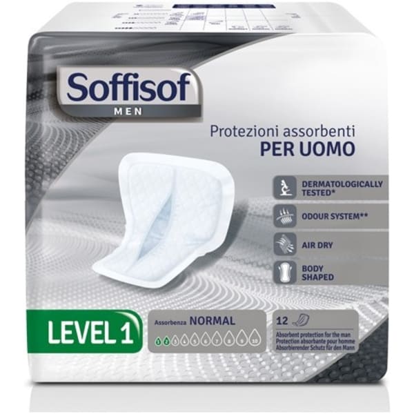La protezione assorbente Soffisof Men Level 1 è indicata per una leggera incontinenza urinaria maschile. Il materassino assorbente, sagomato anatomicamente, è costituito da fluff di cellulosa vergine a fibra lunga certificata PEFC.