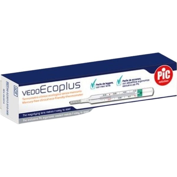 Termometro in vetro che non contiene mercurio. Al suo posto c'è una particolare lega di indio, gallio e stagno. Misura la temperatura corporea ascellare, orale o rettale. È un termometro tradizionale e semplice da utilizzare. Grazie al nuovo look moderno e funzionale e alla lente d'ingrandimento, aiuta a leggere senza sforzo la temperatura. In più è dotato di un particolare abbattitore ergonomico, così far scendere la colonnina dopo la misurazione è veloce e poco faticoso. È contenuto in un apposito astuccio rigido protettivo, per riporlo correttamente.